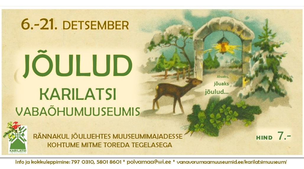 Iga aasta lõpul muutub Karilatsi Vabaõhumuuseum jõulumaaks, kus võib kohata toredaid tegelasi ja kuulda jutte jõuludest vanal ajal. Muuseumi jõuluehtes majad ootavad külla juba pühade lähenedes – nigulapäevast toomapäevani ehk 6. kuni 21. detsembrini. Jõulud on ju aasta oodatuimad pühad. Kindlasti satume nii kaugemasse kui lähemasse minevikku, aga lõpetame ikka piparkoogilõhnalises tänases päevas. Külalised saavad ise etenduses kaasa mängida, laulda, mõistatada ja meenutada. Teekond kestab umbes 1,5 tundi. Jõulud Karilatsis toovad kallid pühad kiiremini kohale!